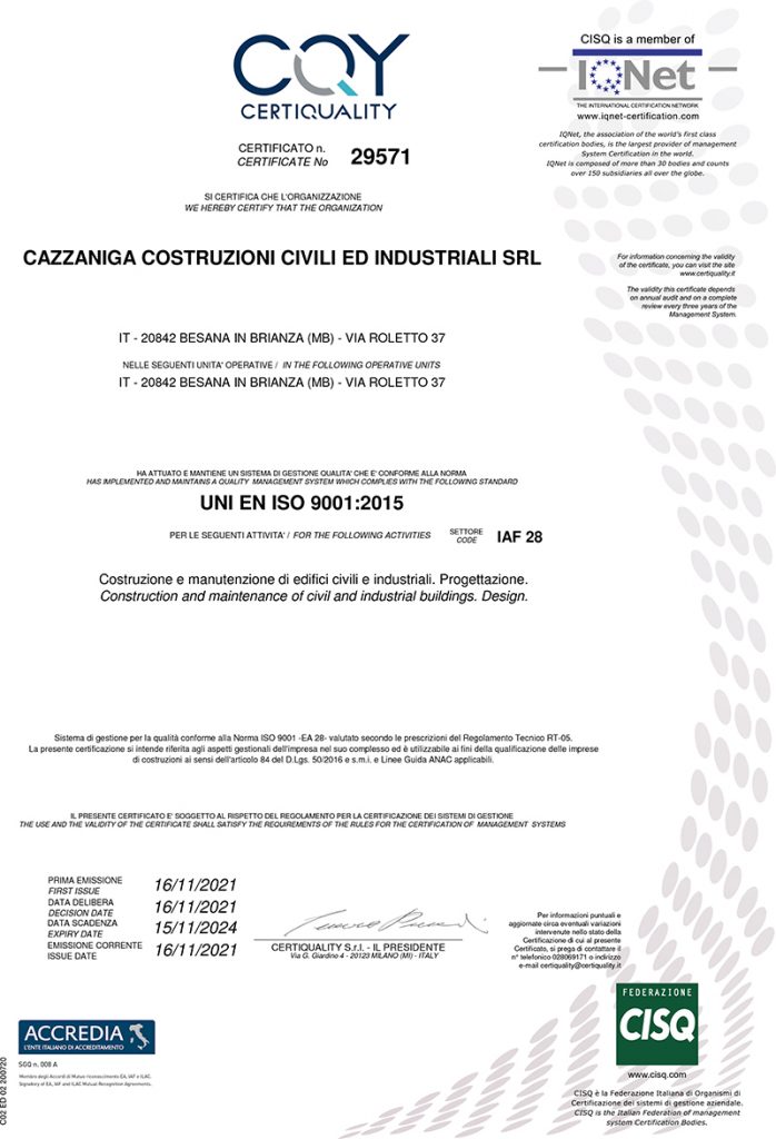 An important milestone for our Company, to be understood not as a simple additional brand, but in the context of a process of continuous improvement, where “working in quality” becomes a daily modus operandi: Guarantee of reliability and control of the construction process in every single aspect for the final Customer.
